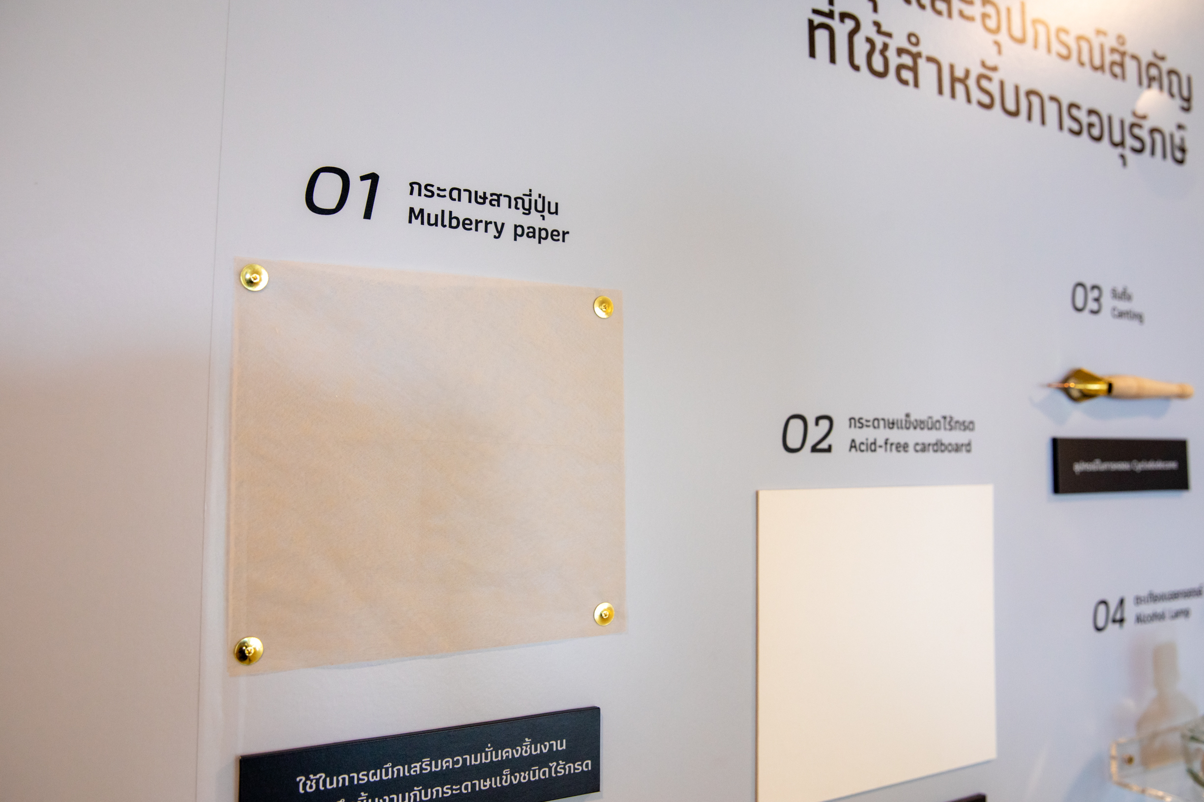 กระดาษสาญี่ปุ่น (Mulberry paper) ใช้ในการผนึกเสริมความมั่นคงชิ้นงาน และยึดตรึงชิ้นงานกับกระดาษแข็งชนิดไร้กรด