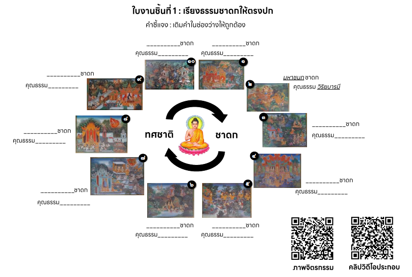 หลังจากนั้นให้แต่ละกลุ่มทำใบงานชิ้นที่ 1 : เรียงธรรมชาดกให้ตรงปก
