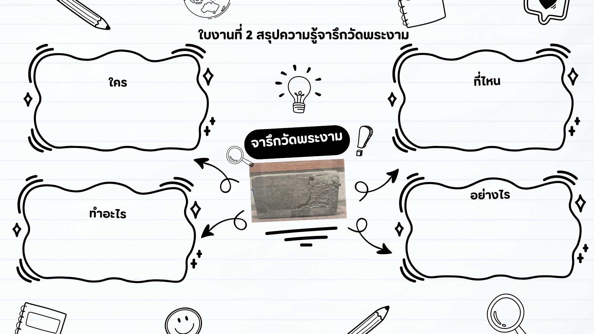 ให้นักเรียนทำใบงานที่ 2 สรุปความรู้จารึกวัดพระงาม ให้นักเรียนสรุปเนื้อหาสำคัญของศิลาจารึกวัดพระงามว่า ใคร ทำอะไร ที่ไหน อย่างไร เป็นรูปแบบแผนผังความคิด