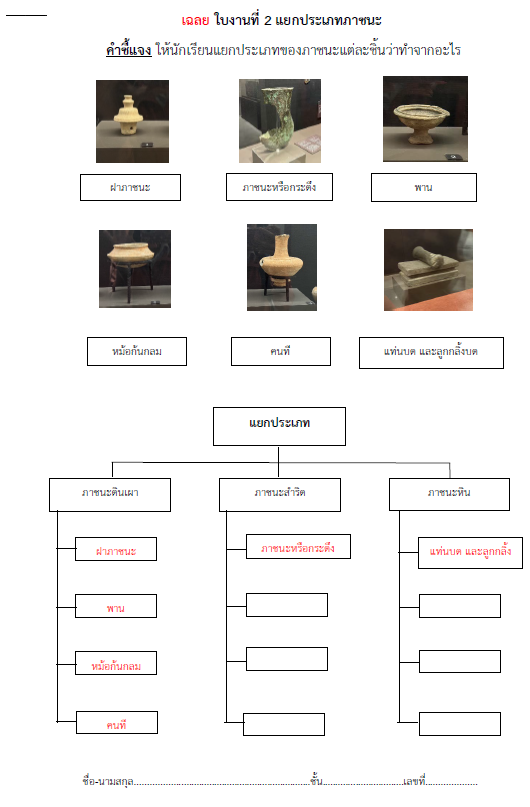 ครูพานักเรียนไปพิพิธภัณฑสถาน พระปฐมเจดีย์ โดยให้นักเรียนศึกษาหาคำตอบที่เกี่ยวกับ ภาชนะในพิพิธภัณฑสถาน พระปฐมเจดีย์ และมีใบงานให้ทำ