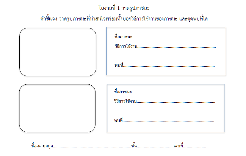 นักเรียนทำใบงานที่ 3 เปรียบเทียบภาชนะในอดีตและภาชนะในปัจจุบันว่ามีความคลายคลึงกับภาชนะชนิดใด พร้อมทั้งให้นักเรียนแสดงความรู้สึกและคิดเห็นอย่างไร ที่รอบตัวเรามีการนำภาชนะในอดีตมาประยุกต์ใช้ในชีวิตประจำวัน