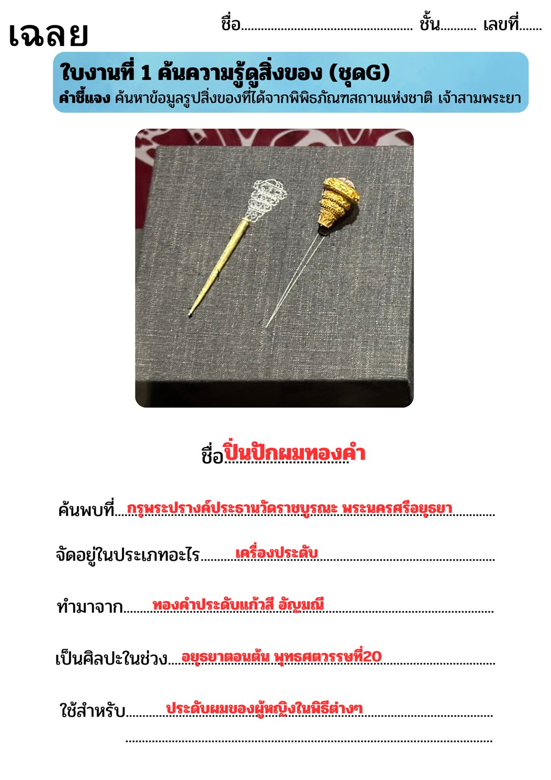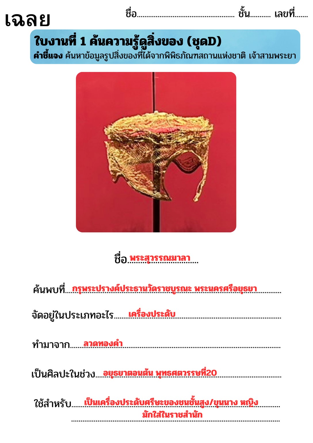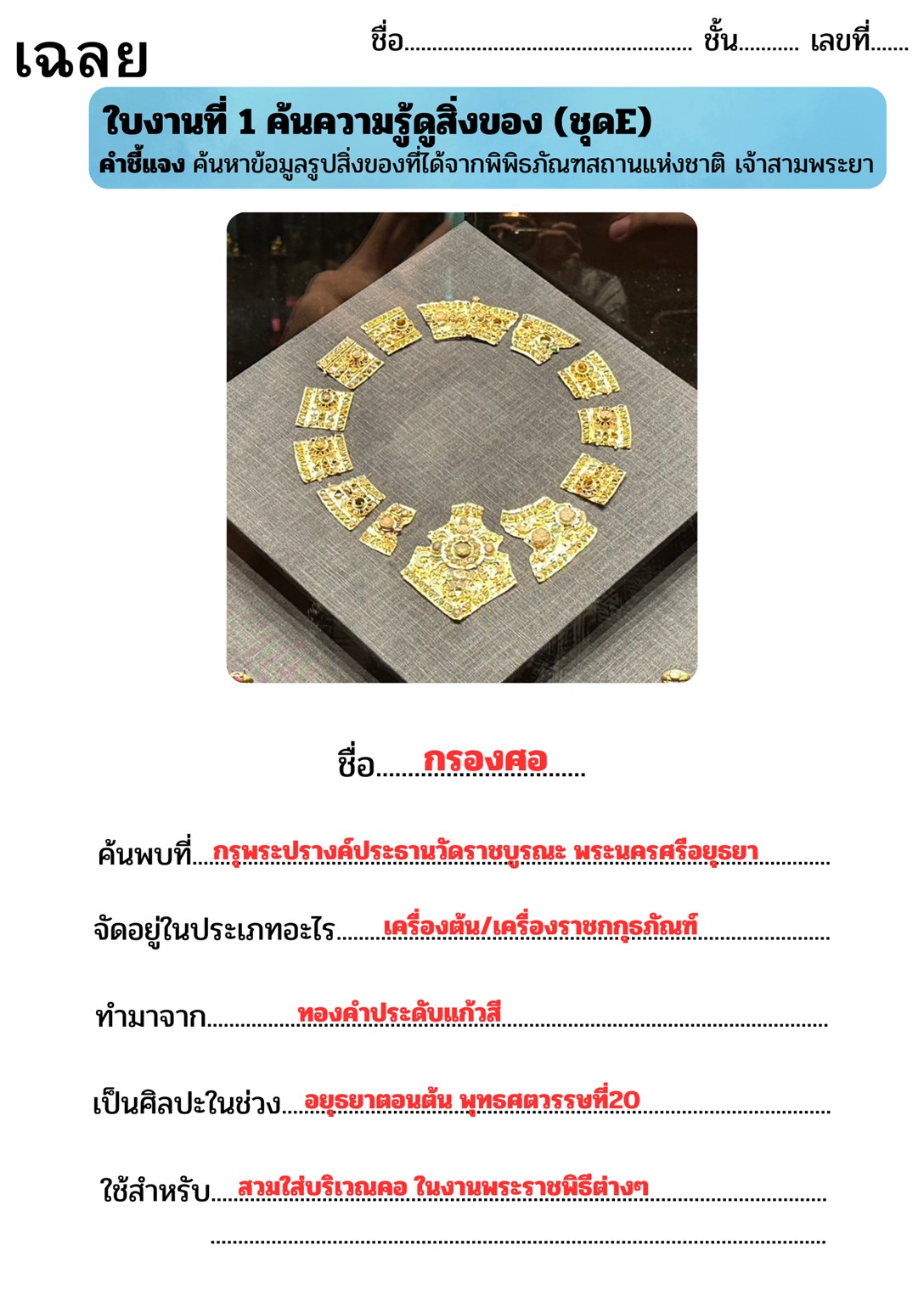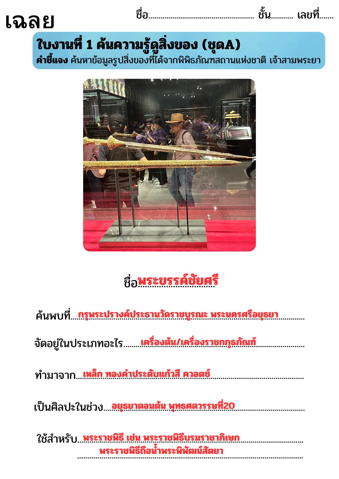 ผู้สอนมอบหมายใบงานที่ 1 ให้นักเรียนค้นหาข้อมูลจากพิพิธภัณฑสถานแห่งชาติ เจ้าสามพระยา