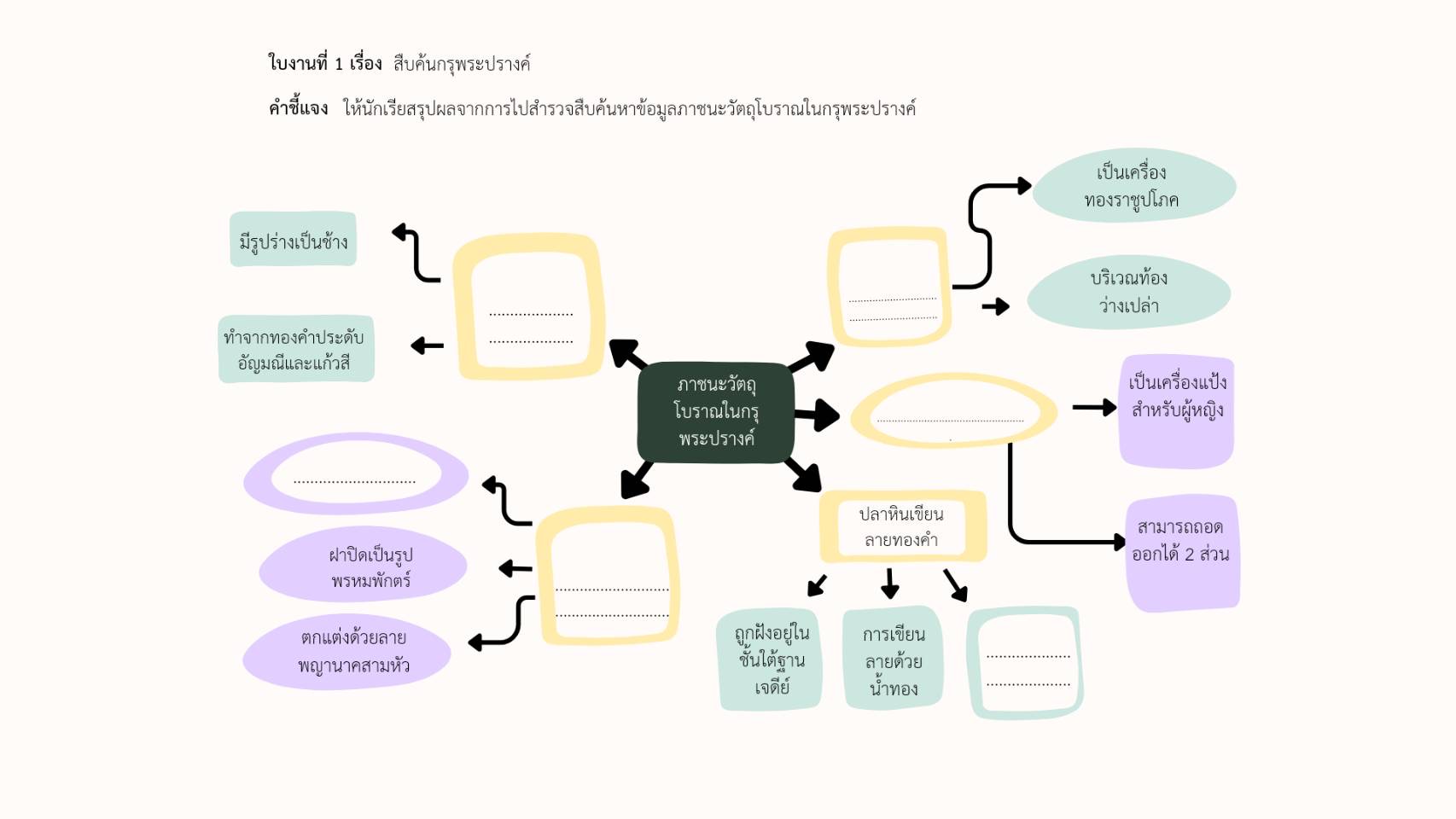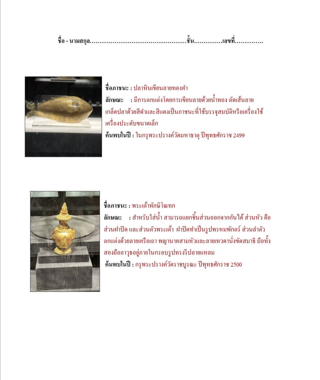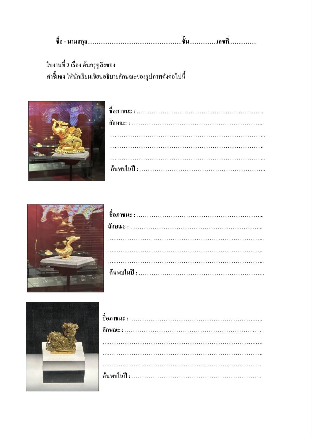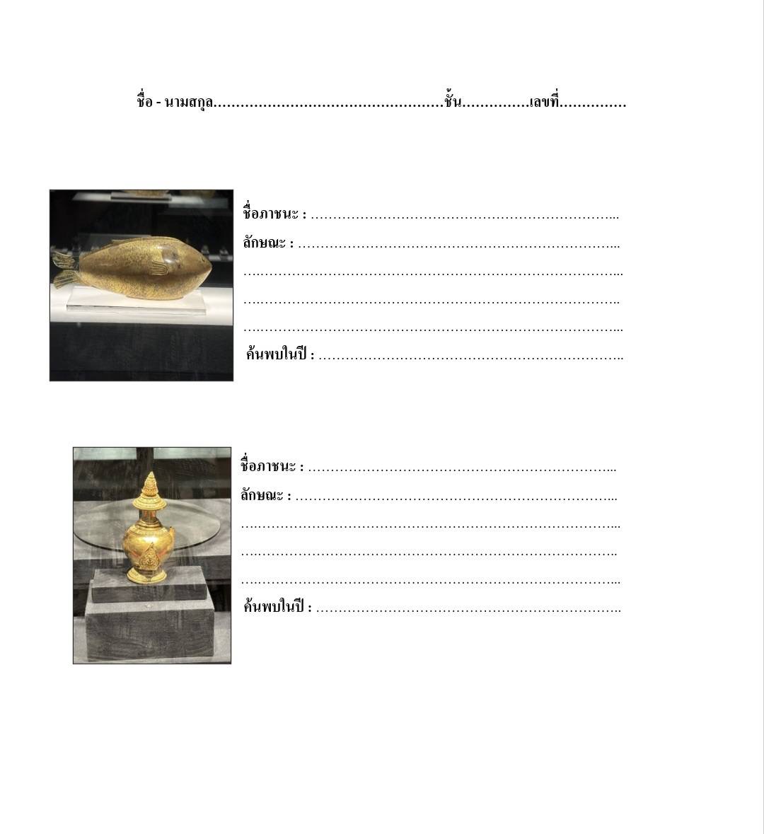 ให้นักเรียนไปสำรวจและสืบค้นหาข้อมูลเพิ่มเติมเกี่ยวกับภาชนะวัตถุในกรุพระปรางค์ต่างๆ ทั้งในเว็บไซต์อินเทอร์เน็ตและการลงพื้นที่จริงด้วยตนเอง ที่พิพิธภัณฑสถานแห่งชาติ เจ้าสามพระยา