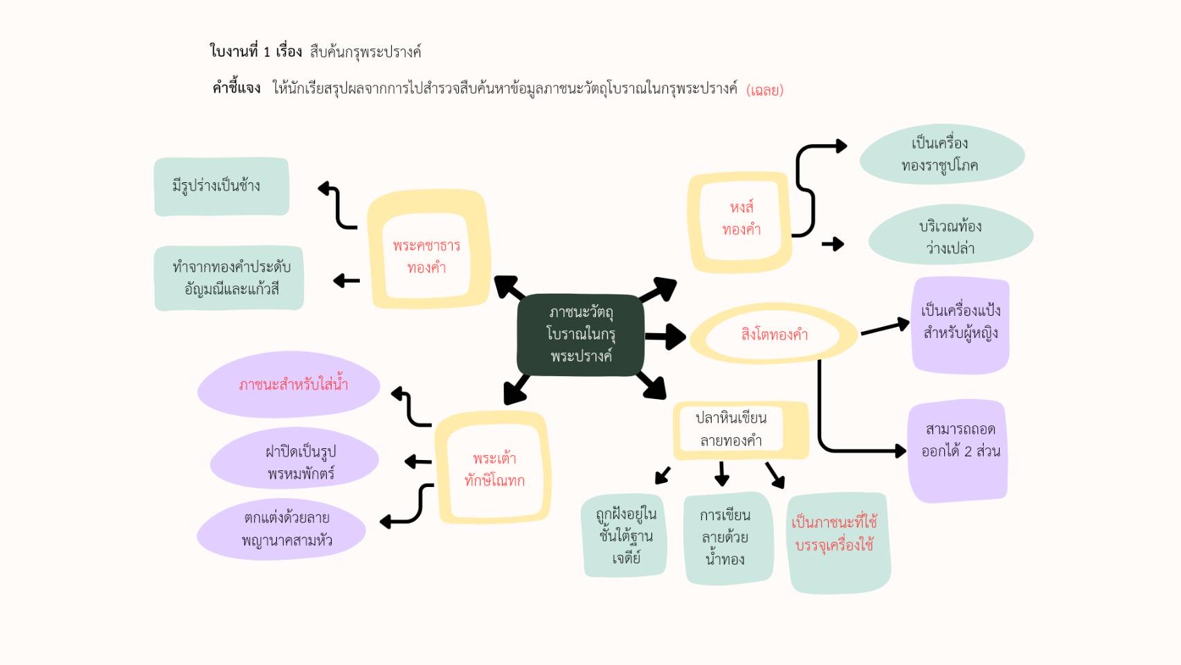 หลังจากที่นักเรียนได้ไปสำรวจที่สถานที่จริงแล้ว ครูจะให้นักเรียนวิเคราะห์ความแตกต่างของภาชนะวัตถุในกรุพระปรางค์แต่ละชนิดว่ามีรูปแบบการใช้งานอย่างไรให้นักเรียนนำเสนอเป็นผังกราฟิกและอภิปรายร่วมกัน