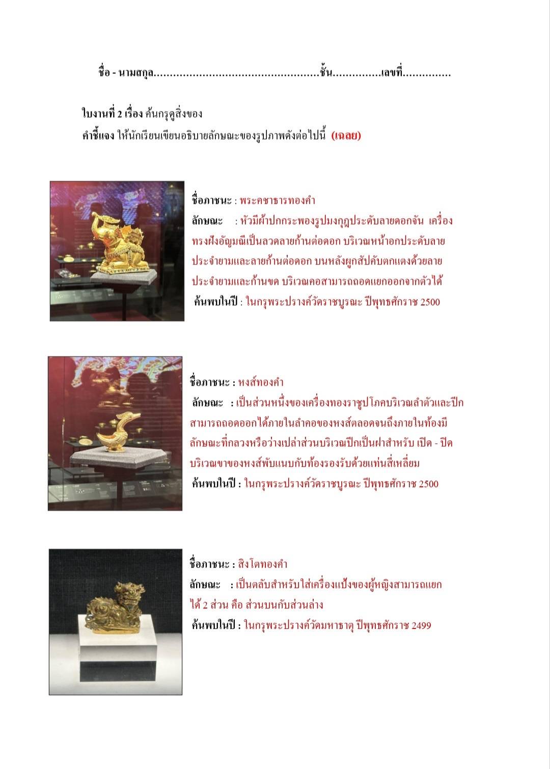 ให้นักเรียนทำใบงานที่ 2 เรื่อง ค้นกรุดูสิ่งของ เป็นรายบุคคลเพื่อประเมินนักเรียนว่ามีความรู้ความเข้าใจในเรื่องภาชนะวัตถุในกรุพระปรางค์ มากน้อยเพียงใด