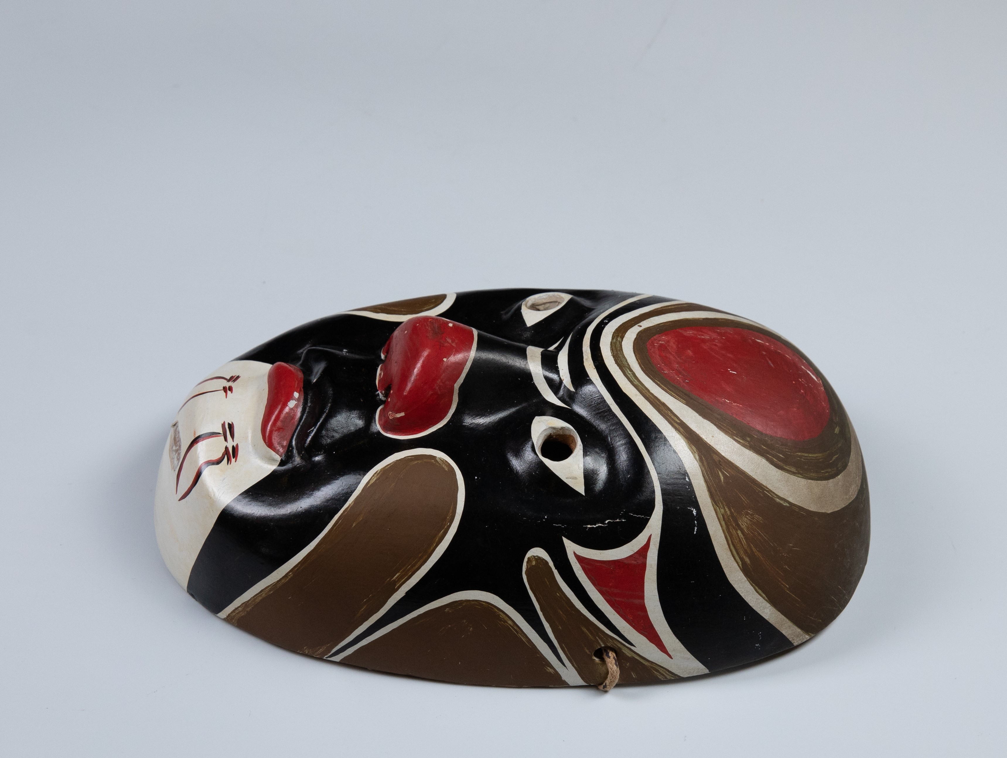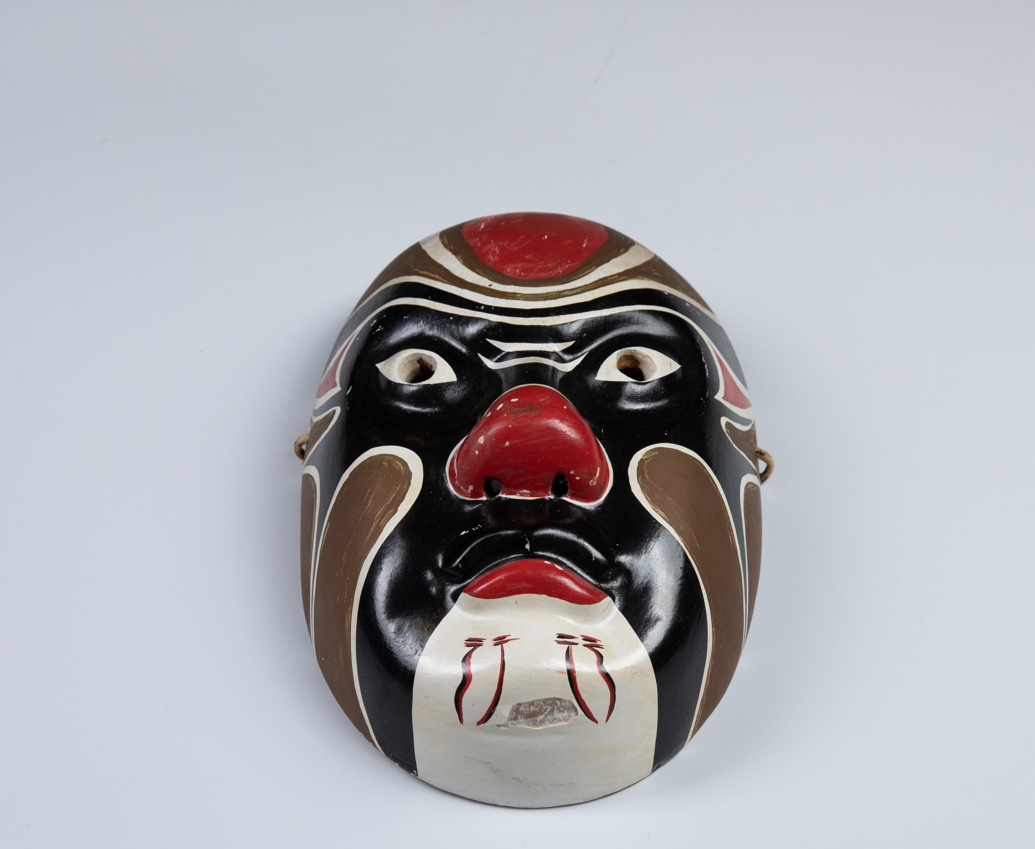 หน้ากากงิ้วที่จัดแสดง ณ นิทรรศการนานาหน้ากาก ชั้น 2 ศูนย์มานุษยวิทยาสิรินธร มีลักษณะ ผิวพื้นใบหน้าเป็นสีดำ กลางหน้าผาก จมูก และริมฝีปากสีแดง แก้มและศีรษะด้านข้างเหนือคิ้วเป็นสีน้ำตาล คางสีขาว